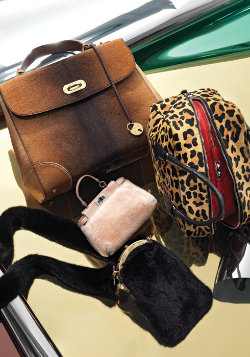 Luxe Exotic(왼쪽부터 시계 방향으로) 탈착 가능한 숄더 스트랩을 더한 송치 소재의 티핀 백. 34X28cm, 4백70만원대 랄프 로렌 컬렉션. 레오퍼드 패턴의 까발리노 스투루쪼 인사이드 백. 27x19cm, 6백80만원대 프라다. 고급스러운 밍크 소재의 프라미 백. 14X21cm, 3백55만원 페라가모. 핑크 양털 소재의 마이크로 피카부 백. 15X12cm, 2백37만원 펜디. Bohemian Fringe (왼쪽 위부터 시계 방향으로) 체인 장식과 프린지 디테일이 매력적인 버킷 백. 17.5X19cm, 1백57만원 델핀들라퐁 by 쿤. 가을 분위기가 물씬 느껴지는 버건디 컬러의 티어드 스웨이드 프린지 버킷 백. 26.5X37cm, 3백만원대 버버리. 부드러운 스웨이드 소재의 미스 비브 까레 마드모아젤 드 라 프랑주. 20.5X19cm, 3백90만원대 로저 비비에.