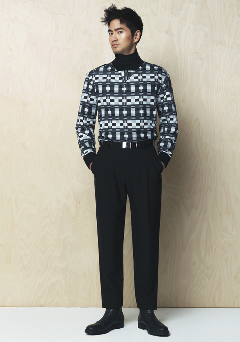 블랙 터틀넥, 패턴 실크 스웨트셔츠, 다크 그레이 팬츠, 벨트와 사선 지퍼 장식의 블랙 앵클부츠 모두 발렌시아가.