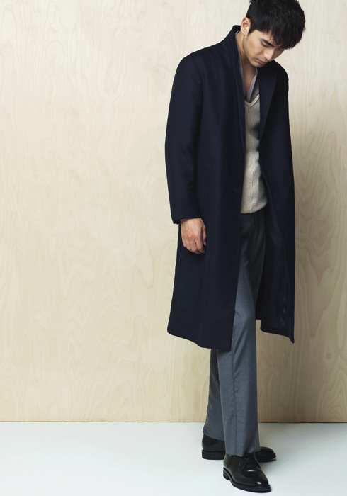 직선적인 실루엣의 네이비 코트, 베이지 컬러 브이넥 니트 베스트, 연보라색 스카프, 그레이 팬츠 모두 프라다. 다크 브라운 슈즈 브루넬로 쿠치넬리.