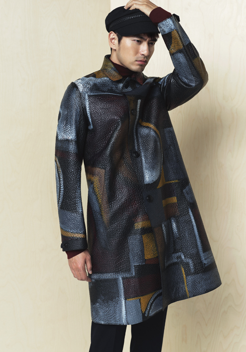 회화적인 프린트 패턴이 돋보이는 가죽 코트 버버리 프로섬. 버건디 컬러 모크넥 니트와 네이비 컬러 울 팬츠 모두 Z 제냐. 블랙 트위드 모자 구찌.
