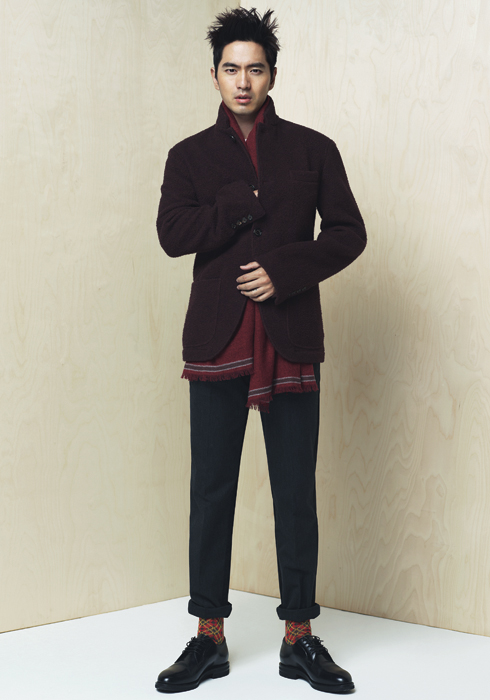 버건디 재킷과 머플러, 다크 브라운 레이스업 슈즈 모두 브루넬로 쿠치넬리. 팬츠 돌체앤가바나.