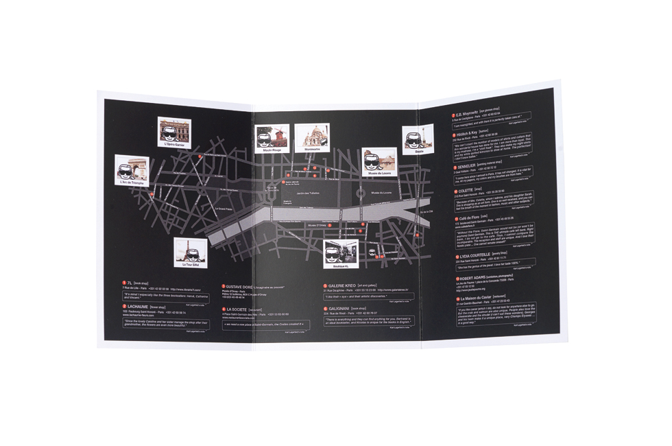파리는 개인적으로 잘 알고 너무나도 좋아하는 도시임에 분명하지만 이번에는 달랐다. 칼 라거펠트가 선호하는 장소를 방문하는 것이 주요 일정일 정도로 사적인 취향으로 짜인 파리 투어는 오로지 칼 라거펠트의 시선으로 본 예술적인 파리를 둘러보는 코스였다. 칼 라거펠트가 가장 사랑하는 파리의 생제르맹(Saint-Germain)에는 그가 즐겨 가는 ‘카페 드 플로르(Cafe´ de Flore)’와  최신 트렌드를 경험할 수 있는 ‘칼 라거펠트 부티크’, 수많은 크리에이티브한 작업이 이뤄지는 그의 스튜디오, 그가 직접 운영하는 서점 ‘7L’이 모두 모여 있다. 생텍쥐페리, 파블로 피카소 등 수많은 문인들이 드나들었던 카페 드 플로르에 갔을 땐 칼 라거펠트의 철학적인 면모를 엿보았고, 릴 스트리트 7번지에 위치해 7L이라고 이름 지은 칼 라거펠트의 서점에선 질서 정연하게 놓인 인테리어, 사진, 패션, 디자인 등 다양한 분야의 서적을 통해 최근 그의 관심사를 면밀히 관찰할 수 있었다. 스스로를 책벌레라고 칭할 만큼 책은 칼 라거펠트에게 중요한 영감의 원천이다. 이 사실은 서점 안쪽에 위치한 그의 스튜디오에 들어서면 더욱 명확해진다. 족히 3층 건물 높이 정도는 되어 보이는 천장 높은 스튜디오엔 수만 권은 될 듯한 책이 빼곡하게 채워져 있었다. 천장까지 가득 쌓인 책들을 정말로 다 읽었을까 싶지만, 그가 그동안 펼친 활동만 보아도 충분히 읽고 남았으리라 유추할 수 있다. 그는 책을 살 때 총 3권을 사는 것으로 알려져 있는데, 한 권은 읽기 위해, 다른 한 권은 분책하기 위해, 나머지 한 권은 소장하기 위해서다. 생제르맹의 메인 스트리트에 있는 칼 라거펠트의 부티크는 그를 대변하는 컬러인 블랙 & 화이트로만 구성되어 있다. 그리고 매장 쇼윈도의 대형 네온사인에는 우리는 감히 상상하지 못한 칼 라거펠트의 명언이 담겨 있다. ‘I only wear the latest thing(나는 오직 최신의 것을 입는다)’.