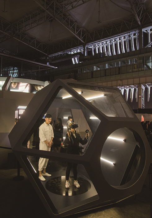 에르메스가 상하이에서 단 하룻밤, 환상적인 우주선과 조우했다. 에르메스 남성 유니버스 아티스틱 디렉터 베로니크 니샤니앙(Ve´ronique Nichanian)이 기획한 이번 ‘패스트 포워드 멘(Fast Forward Men)’은 에르메스의 2018 S/S 남성 컬렉션을 단지 보면서 즐기는 것뿐만이 아니라 직접 몸과 분위기로 느끼고, 체험해보는 행사였다. 건물 안으로 들어서니 공상 과학 영화 세트처럼 엄청나게 밝은 조명의 입체적인 빛의 통로가 나타났다. 현실 세계와 차단된, 새로운 세상에 발을 내딛는 듯한 느낌. 낯설지만 기분 좋은 흥분이 느껴지는 이곳에서 에르메스의 패스트 포워드 멘 월드가 시작되었다. 첫 이벤트는 기나긴 런웨이에서 펼쳐진 2018 S/S 컬렉션 패션쇼. 상하이의 톱 모델들은 물론 건축가, 아티스트, 앵커, 셰프, 운동선수 등 직업이 다양한 유명인들도 모델로 참여한 흥미로운 패션쇼였다. 에르메스만의 고급스러움이 돋보이는 가운데 무심한 듯 세련된, 평범한 듯 비범한, 노멀한 듯 트렌디한 스타일링을 선보였다. 볼륨과 길이의 레이어링, 기본 컬러에 더해진 깊고 진한 컬러, 도시적인 스포티즘이 특히 돋보였다. 여러 소재 가운데 가장 눈에 띈 것은 트왈브라이트(Toilbright) 소재. 반짝임과 선명한 색조로 이번 컬렉션에서 가장 눈길을 끌었다. 그 밖에 크리스피한 소재의 치노스, 루스하고 와이드한 팬츠, 크로커다일과 스웨이드 소재의 서머 재킷, 스포티한 스티치와 벨트, 몽크 샌들 등이 에르메스 2018 S/S 컬렉션의 주요 스타일을 완성했다. 화려한 쇼가 끝난 후 관객들이 안내된 곳은 다양한 여행을 즐길 수 있는 거대한 판타지 월드였다. 실험실(Lab Bar)에서는 작업대 너머로 장난기 있지만 명석한(그래서 또 살짝 제정신이 아닌) 어느 과학자가 실험 도구를 통해 시계, 넥타이 또는 가죽 재킷을 만드는 장인의 제스처를 보여주었다. 지구의 중력(gravity on earth)을 표현하는 무대에서는 끊임없이 움직이는 인간 진자(a human pendulum)를 향해 흔들리는 2개의 거대한 오뚝이가 우아한 움직임을 반복하며 곳곳에 존재하는 우주 공간을 탐험했다. 그다음에 만난 것은 우주 비행사들의 필수품인 우주복. 과연 어떤 스카프, 어떤 가방이 이 우주복과 잘 어울릴까? 준비를 모두 마치자 에르메스의 동반자인 날개 달린 말 페가수스(Pegasus)가 첫 번째 가상 비행을 위해 관객을 안내했다. 그 옆, 맞춤형 기능을 갖춘 탐험선을 우주선 내 거대한 정비 작업장에서 수리 중이다. 맞춤형 스포츠카, 가죽으로 만든 자전거, 사바나 컬러의 서프보드 등의 시연이 진행되는 동안 조종사들의 라운지 바가 오픈되었다. 또 다른 공간 비스포크 갑판(Bespoke Deck)은 역설을 체험하는 곳이다. 복잡함 또는 정밀한 노하우를 담은 단순함을 보여주는 곳. 시간을 측정하면서 생명을 불어넣어주는 여러 단계들과 부품을 직접 발견할 수 있었다. 인생과 스타일을 조립하고 해체하고 또다시 조립해보는 시간이라고나 할까. 그 밖에 샹 당크르(Chane d’Ancre) 체인으로 만든 상상 속 뱀을 조작하는 놀이, 여덟 벌의 재킷을 통해 떠나보는 과거로의 시간 여행, 군중의 코앞에서 날아다니며 분위기를 조성하는 하이브리드 생명체, 드론의 리드미컬하고 우아한 비행, 푸드 트럭, 디제잉, 라이브 밴드 공연…. 끝없는 놀라움과 즐거움은 초대된 모든 이들을 에르메스의 특별한 시간과 공간에 빠져들게 만들었다.