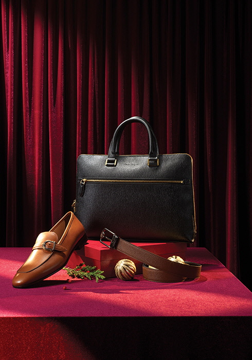가죽의 질감에서 고급스러움이 자연스럽게 묻어나는 리바이벌 비즈니스 백 1백60만원대, 클래식 벨트 50만원대, 옅은 브라운 컬러가 돋보이는 포트랜드 슈즈 90만원대.