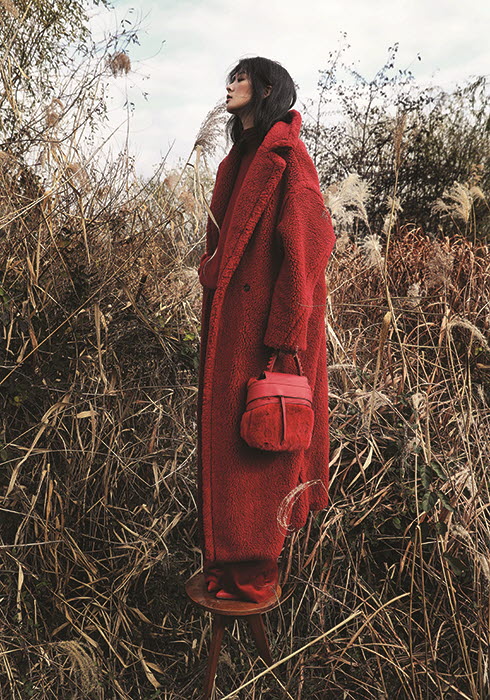 레드 퍼 코트, 레드 터틀넥, 니트 톱, 레드 팬츠 모두 가격 미정 막스마라.