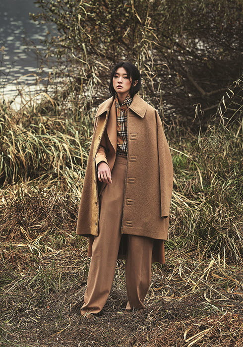 베이지 롱 코트 3백20만원 로에베. 베이지 체크 셔츠 69만원 버버리.