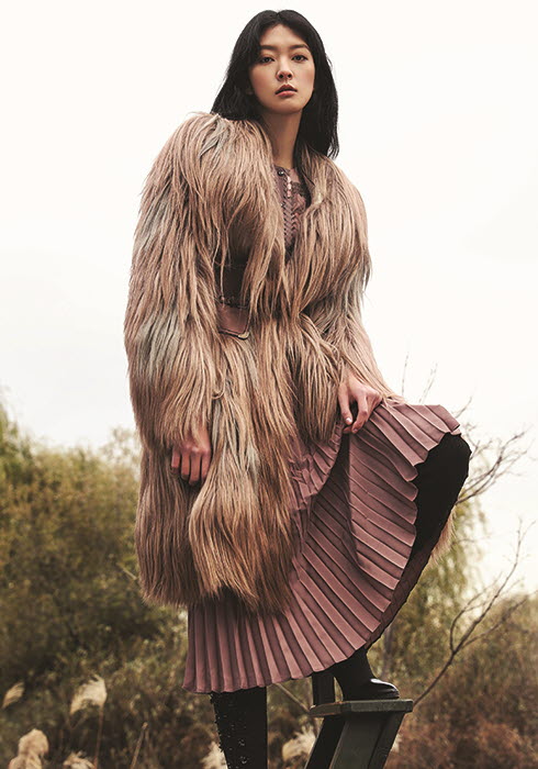 브라운 퍼 코트, 플리츠 롱 원피스, 브라운 벨트 모두 가격 미정 보테가 베네타. |