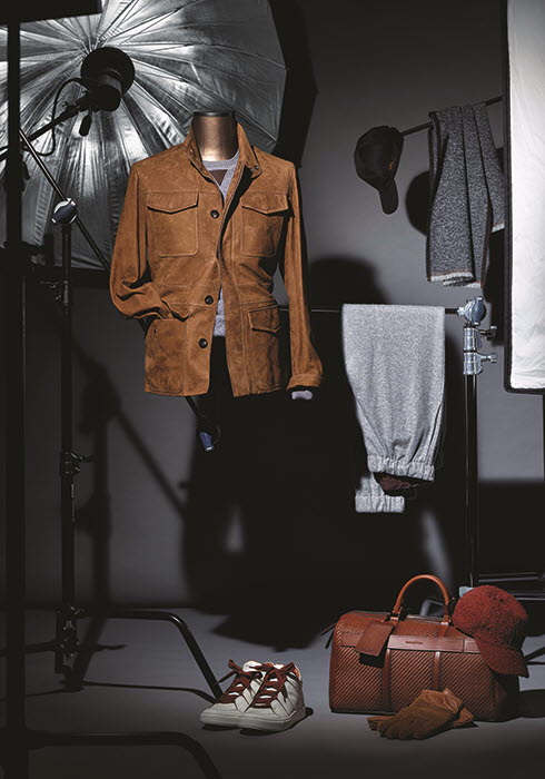 누벅 레더 소재 필드 재킷, 캐시미어와 실크에 목부분의 누벅 레더 디테일을 더한 ‘세컨 스킨 캡슐 컬렉션’의 크루넥 부클레 니트 웨어 모두 에르메네질도 제냐. 블랙 색상의 캡, 그레이 머플러, 캐시미어와 코튼 소재의 라이트 그레이 색상 트라우저 모두 에르메네질도 제냐 꾸뛰르. (아래 왼쪽부터)  엑스트라 라이트 러버 솔을 매치한 하이톱 티지아노 스니커즈, 비큐나 색상의 펠레 테스타 홀드올 백, 곱슬거리는 질감의 카센티노 효과의 캡 모두 에르메네질도 제냐 꾸뛰르.
