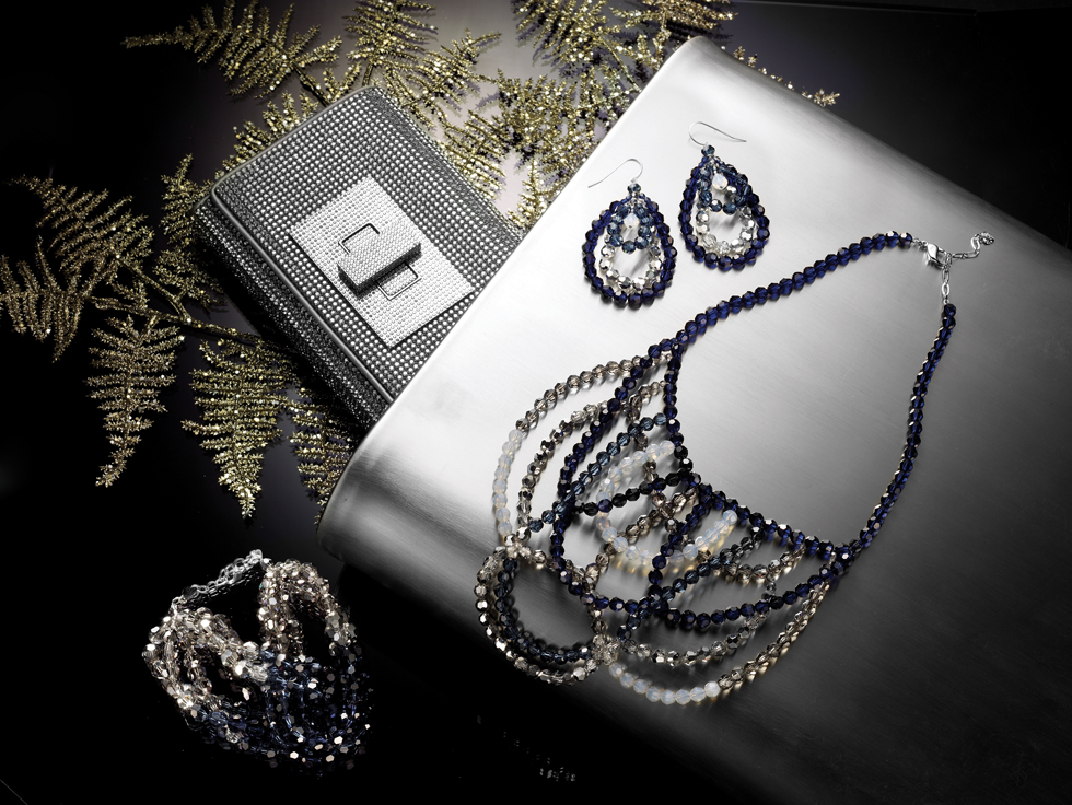 화려한 연말 모임에 잘 어울리는 메디시스 주얼리 컬렉션. 블루와 화이트, 블랙 크리스털을 손으로 하나하나 비딩해 섬세하고 화려하다. 샹들리에 귀고리는 25만원, 드레이프가 멋진 네크리스는 63만원, 볼드한 브레이슬릿은 51만원. 모두 스와로브스키.