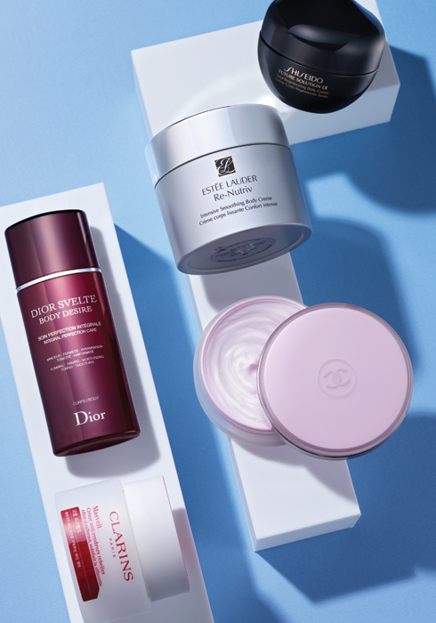 1974년 처음 출시된 이후 세 번에 걸친 업그레이드를 통해 더욱 강력해진 효과로 돌아온 ‘클라란스 크렘 마스벨트’는 ‘보디 컨투어링 전문가’인 클라란스의 제품답게 고질적인 지방에 집중적으로 작용해 4주 후 매끈하게 정돈된 복부와 허리 라인을 확인할 수 있는 획기적인 크림이다(200ml 7만원대). 슬리밍·퍼밍·모이스처라이징·토닝·스무딩 효과를 한 번에 모두 느끼고 싶다면 ‘디올 스벨트 보디 디자이어 인테그럴 퍼펙션 케어’를 주목할 것. 지방조직 내부의 분화하지 않은 새로운 지방세포까지 겨냥해 보디라인을 슬림하게 가꿔주는 것은 물론 실크처럼 매끄러운 텍스처로 부드러운 피붓결을 얻을 수 있다(200ml 8만4천원). ‘에스티 로더 리-뉴트리브 인텐시브 스무딩 보디 크림’은 에스티 로더의 럭셔리 안티에이징 라인에서 선보이는 보디 크림으로, 피부 탄력을 집중적으로 끌어올리고 싶은 이에게 추천한다. 무루무루 버터, 시어버터, 글리세린을 풍부하게 함유해 건조한 보디 피부에 수분을 공급하고 엘라스틴, 프렌치 헤더 추출물, 펩타이드 AH-8 성분이 피부에 탄력을 더한다. 가격이 다소 비싸지만 ‘짐승 용량’이라고 불러도 될 정도로 대용량의 크림이다(300ml 20만원대). ‘시세이도 퓨처 솔루션 LX 토탈 리제너레이팅 보디 크림’은 독자적인 안티에이징 성분인 스킨제네셀 1P와 부기를 완화하고 혈액순환을 돕는 약모밀, 안젤리카 뿌리 추출물을 담아 보디 피부의 신진대사를 근본적으로 개선한다. 24시간 수분 유지 효과로 피부를 촉촉하고 매끈하게 가꿀 수 있으며 특히 마사지를 병행하면 보디 탄력은 물론 부기에도 효과가 탁월하다(200ml 15만원). 향수 못지않은 향과 매끄러운 피붓결을 모두 원한다면 ‘샤넬 샹스 오 땅드르 모이스처라이징 보디 크림’이 제격. 생크림같이 부드러운 질감이 단연 돋보이며 프루티 플로럴 계열의 향이 기분까지 상쾌하게 한다. 피부 탄력과 보습 효과는 당연히 훌륭하다(200ml 14만원).