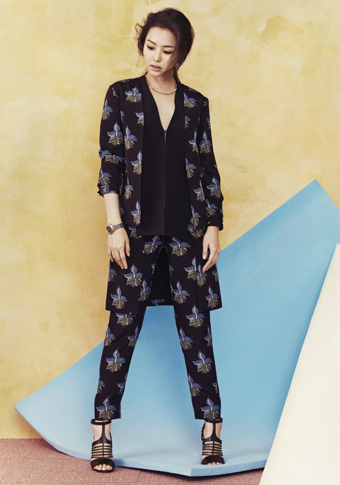오키드 프린트 기모노 재킷 2백71만원, 오키드 프린트 실크 팬츠 1백99만원, 브라스 메탈 체인 목걸이 59만원, 다이아몬드와 토파즈를 세팅한 시계 4백60만원, 멀티 스트랩 슈즈 1백79만원 모두 펜디. |