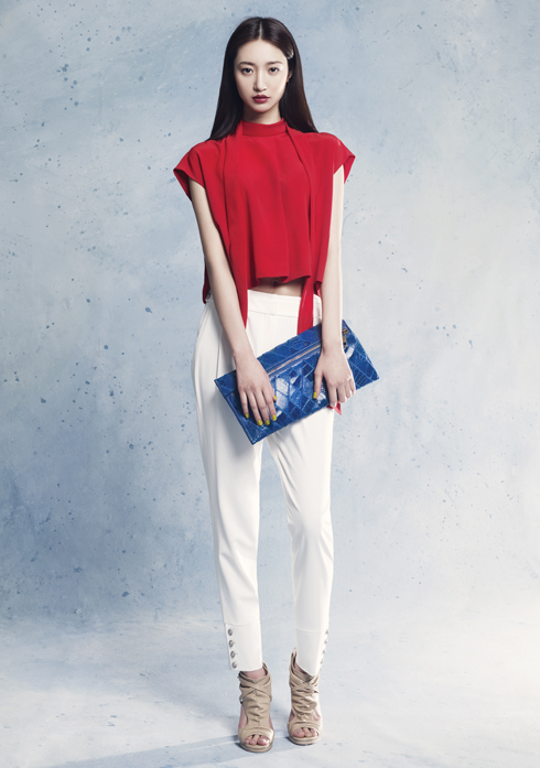 레드 블라우스 가격 미정 끌로에 by 무이. 화이트 팬츠 32만원 더 아이잣 컬렉션. 블루 컬러 악어 클러치 5백만원대 콜롬보. 뉴트럴 컬러 오픈토 하이힐 가격 미정 모그.