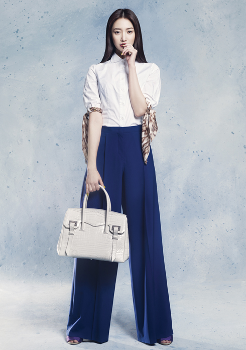 화이트 셔츠 60만원대 저스트 까발리. 블루 와이드 팬츠 1백만원 질 샌더. 바이올렛 컬러 샌들 1백만원대 펜디. 화이트 컬러 악어 가죽 빅 백 2천만원대 콜롬보.