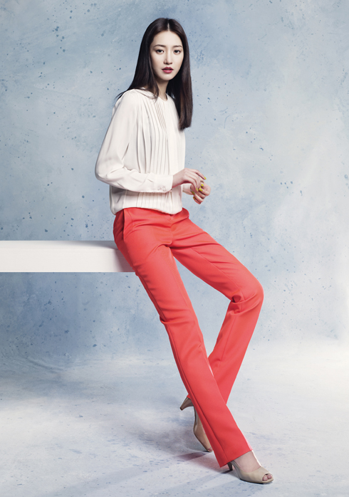 부드러운 실루엣의 화이트 블라우스 2백29만원 아뇨냐. 네온 컬러 팬츠 92만원 질 샌더. 스킨톤 오픈토 미들 슈즈 17만원 나인 웨스트.