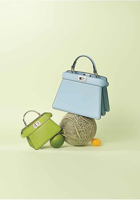 파스텔 옐로 그린 컬러로 시선을 사로잡으며 실버 메탈 핸들의 한쪽을 분리해 참으로도 사용 가능한 피카부 아이씨유 마이크로 백 2백만원대, 귀여운 사이즈에 탈착 가능한 스트랩, 적당한 수납공간까지 갖춰 실용성을 높인 파스텔컬러 피카부 아이씨유 쁘띠 백 4백만원대 모두 펜디.