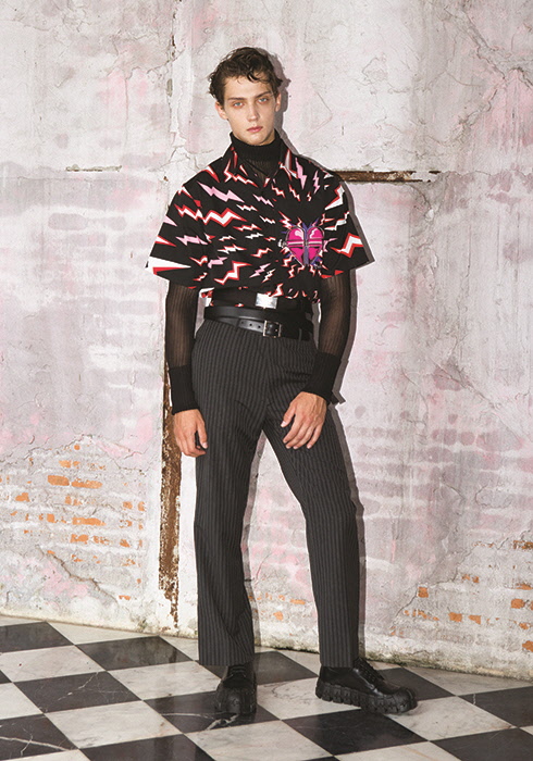 반소매 패턴 셔츠 1백19만원, 스트라이프 팬츠 1백19만원, 블랙 레이스업 슈즈 1백8만원, 레더 벨트 59만원, 캔버스 벨트 50만원 모두 프라다. 블랙 시스루
