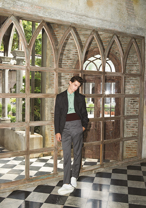 스트라이프 재킷 가격 미정, 민트 그린 셔츠 55만원, 그레이 팬츠 가격 미정, 버건디 웨이스트 밴드 17만원, 화이트 스니커즈 89만원 모두 살바토레 페라가모.