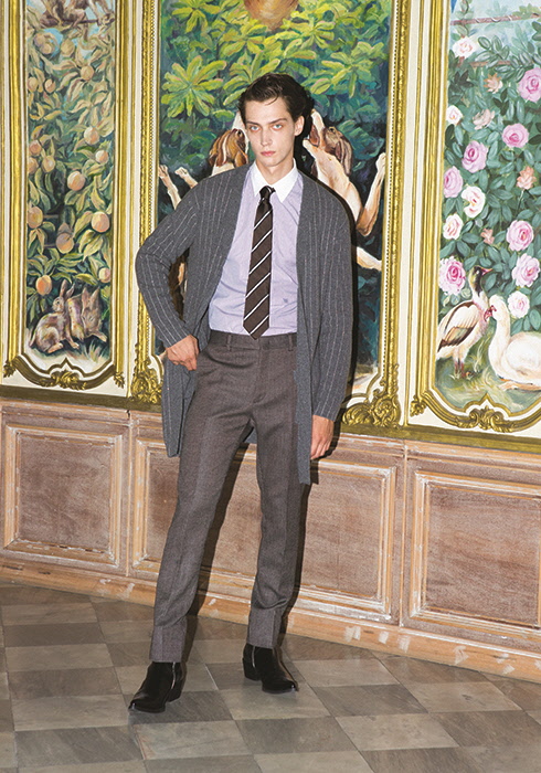 스트라이프 카디건, 셔츠, 타이, 그레이 팬츠, 부티 모두 가격 미정 펜디.