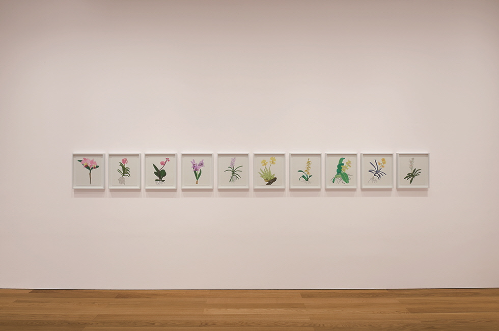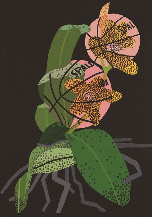 S 어떤 작품은 잡지에서 발췌한 이미지에 당신의 다른 식물 작업 속 이미지를 재현하는 등 출처가 다양한 이미지 콜라주로 구성되어 있죠. 예를 들어 이번 전시 작업인 ‘Small Yellow Orchid with Baby Snake’(2020)에서 노란색 난초 이파리에 둥글게 말린 뱀이 둥지를 튼 모습이 보여요. 또 다른 페인팅 ‘Bball Orchid with Dots #2’(2021)에서는 난초의 꽃잎 부분이 농구공과 혼합되어 있는 특징이 눈에 띄고요. 작품을 위해 자연물과 인공적 요소를 고르고 매치하는 기준은 무엇인가요?