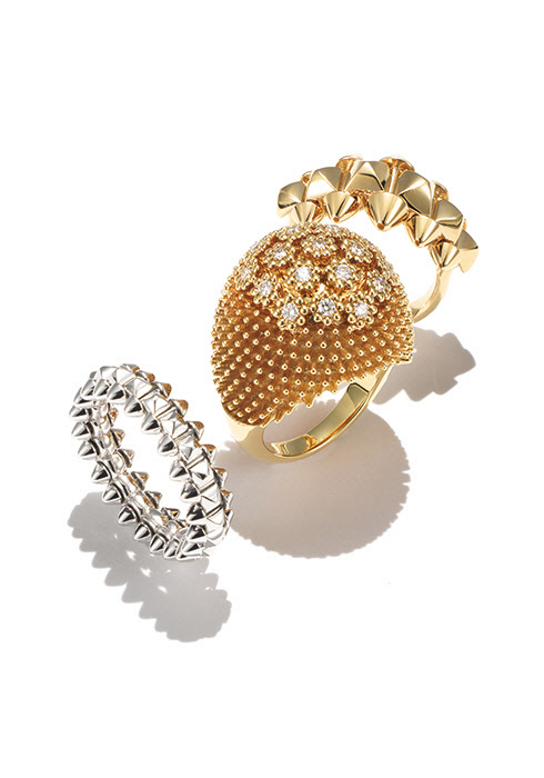 화이트 골드로 구현한 뾰족한 스터드와 둥근 피코 장식의 대립적인 코드가 시선을 끄는 매혹적인 클래쉬 드 까르띠에 링 3백1만원, 핑크 골드와 다이아몬드가 어우러져 선인장의 매혹적인 모습을 표현한 칵투스 드 까르띠에 링 1천8백30만원, 강렬한 개성과 자유로움을 담아낸 핑크 골드 클래쉬 드 까르띠에 링 6백20만원. 모두 까르띠에. 문의 1566-7277