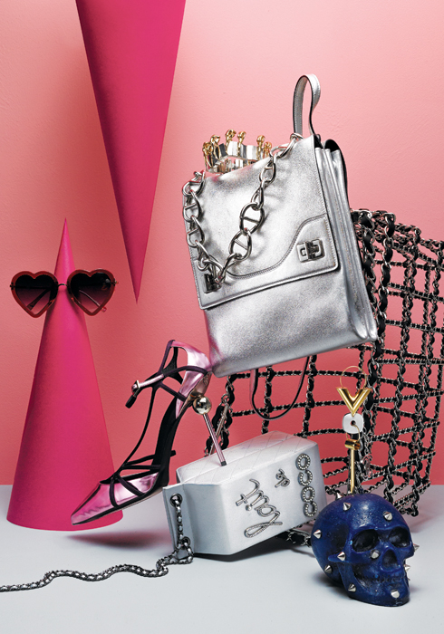 Magic Metallic (오른쪽 위부터 시계 방향으로)사람 모티브 캐릭터가 줄지어 매달려 있는 메탈릭한 뱅글 2백만원대 디올. 소가죽 소재의 실버 비텔로 소프트 백. 22X25cm, 4백만원대 프라다. 에센셜 V 이어링 1백만원대 루이 비통. 스터드 장식의 해골 모티브 양초 11만5천원 VD 초이스 by 비이커. 우유 팩 형태의 코코 라떼 백. 30X21cm, 가격 미정 샤넬. 굽에 은색 구슬이 달린 스틸레토 힐 2백만원대 로저 비비에. 하트 모티브 선글라스 32만원 마커스루퍼 by 한독. Kidult Fantasy(왼쪽부터 시계 방향으로) 안경 프린트 소가죽 파우치 10만원대 레베카 밍코프. 폭스 퍼를 트리밍한 슈즈 가격 미정 펜디. 구두에 매달려 있는 키 링 30만6천원 야즈부키 by 쿤. 새 모티브 오브제 60만원대 에르메스. 피아노 건반을 새긴 사각 클러치 백. 19X21cm, 1백29만원 레뻬띠주 by 꼬르뽀. 맥도날드 우유 상자 형태의 가방.14X17cm, 1백7만원 모스키노. 악어 오브제 60만원대, 말 인형 1백만원대, 프티 스카프 20만원대 모두 에르메스.