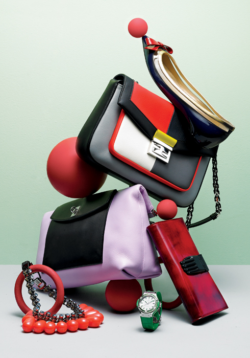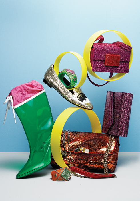 Glittering Galaxy(오른쪽 위부터 시계 방향으로)글리터 소재 루루 버니 백. 17 X11cm, 1백66만원 생로랑. 아크릴 클러치. 17X13.5cm, 1백만원대 지미 추. 스팽글이 뒤덮인 체인 숄더백. 25X16.5cm, 4백50만원 로저 비비에. 주황색 뱅글과 위의 녹색 뱅글 각 2백만원대 모두 샤넬. 장화를 연상시키는 PVC 앵클부츠 90만원대 미우미우. 눈 프린트 슬립온 슈즈 35만7천원 키아라 페라그니 by 쿤 위드 어 뷰. Candy Pop(오른쪽 위부터 시계 방향으로)리본 장식 플랫 슈즈 97만원 크리스찬 루부탱. 컬러 블록이 돋보이는 비 바게트. 25.5X17cm, 가격 미정 펜디. 손 모양 클립 장지갑 39만5천원 오프닝 세레모니 by 톰 그레이하운드. 빅뱅 스틸 뚜띠 프루티 미러 애플 워치 2천4백만원대 위블로. 볼드한 구슬이 달린 네크리스 1백만원대 마위 by 비이커. 핑크와 블랙의 조화가 모던한 백. 32X24cm, 5백만원대 디올.