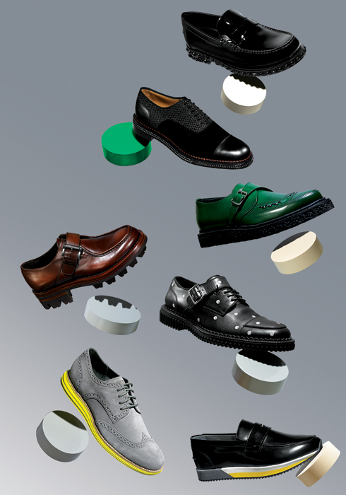 단순히 두꺼운 디자인이 아닌 스터드와 체인 장식, 톱니바퀴 디테일로 굽에 힘을 준 투박한 남자 구두가 대세다.