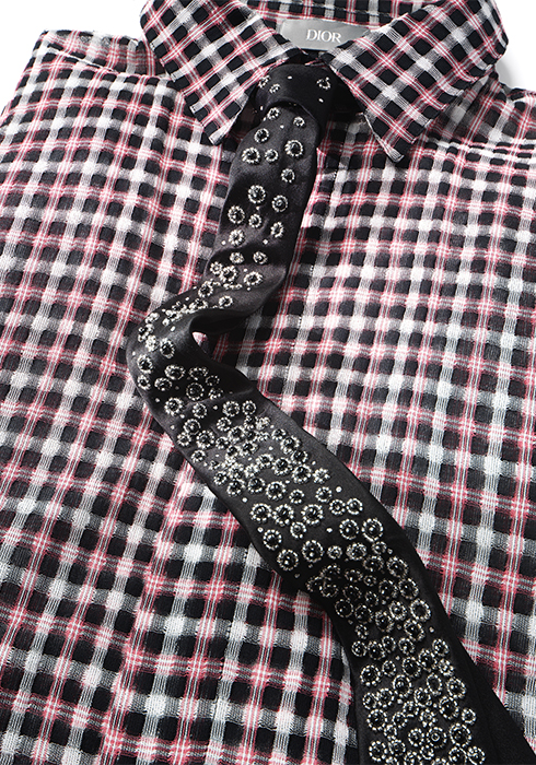 화려한 장식으로 완성한 드레시 무드의 블랙, 핑크, 화이트 컬러 오픈 체크 패턴 코튼 셔츠. 캐주얼 룩과 포멀 룩을 아우르는 유연한 실루엣이 특징으로 얇고 가벼워 은은하게 비쳐 보인다. 1백65만원. 크고 작은 비즈를 수놓은 블랙 타이 가격 미정. 모두 디올 맨. 문의 02-3480-0104