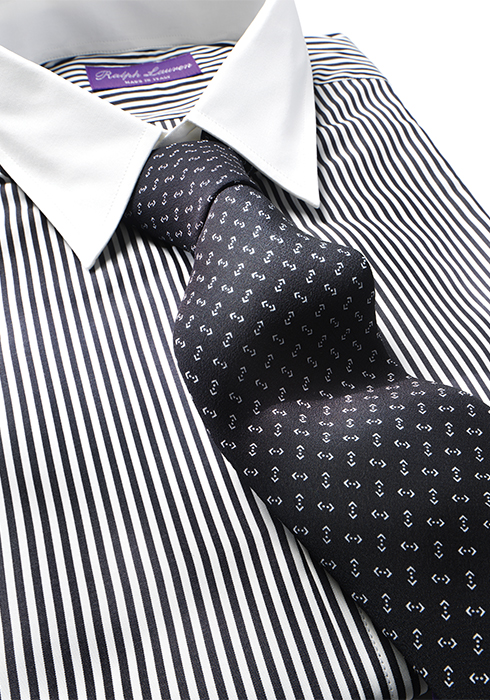 포멀 룩에 활기를 불어넣어줄 재치 있는 패턴 온 패턴 플레이. 배색 칼라로 포인트를 준 블랙 & 화이트 스트라이프 포플린 셔츠 59만원대, 반복적인 기하학 프린트로 경쾌함을 더한 실크 타이 가격 미정 모두 랄프 로렌 퍼플 라벨. 문의 02-3438-6235
