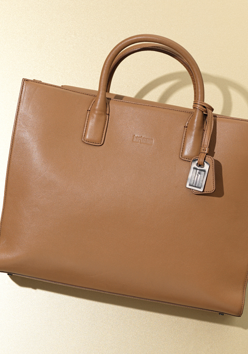 고급스럽고 세련된 캐멀 컬러의 베지터블 탠 레더 아쉬본 브리프케이스. 40X29cm, 1백19만원 하트만.