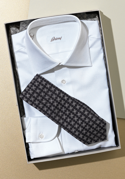 화이트 코튼 셔츠 82만원, 토트 패턴의 울 타이 35만원 모두 브리오니.