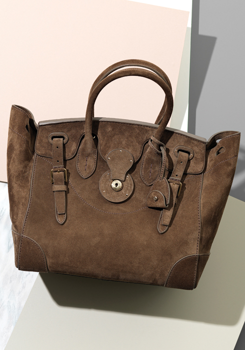 멋스러운 초콜릿 컬러의 스웨이드 소프트 리키 백. 27X20cm, 2백23만원 랄프 로렌.