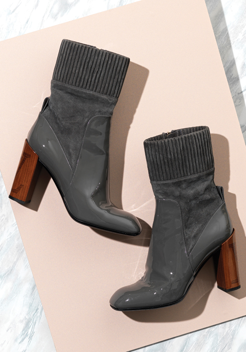 스웨이드로 만든 발목의 밴딩 디테일이 멋스러운 페이턴트 스튜디오 앵클부츠 1백60만원대 루이 비통.