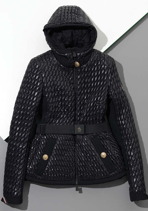 니트 같은 짜임 디테일이 유니크한 벨트 장식의 여성 스키 웨어 스타일 구스 점퍼 2백49만원 몽클레르 그레노블.