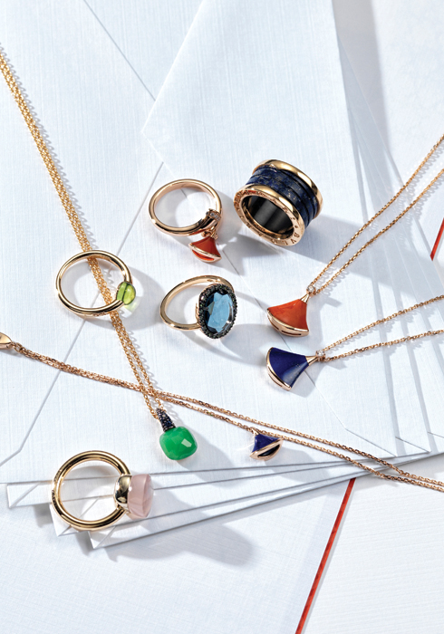 여성의 관능미를 돋보이게 하는 디바 컬렉션 레드 코넬리안 링 2백만원대, 핑크 골드에 블루 마블을 매치한 비.제로원 링 1백만원대, 레드 코넬리안 펜던트와 블루 라피스 네크리스 각 2백만원대, 핑크 골드에 라피스를 세팅한 브레이슬릿 각 2백만원대 모두 불가리.