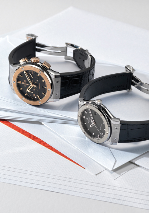 (위부터) 45mm의 파워가 느껴지는 볼드한 케이스에 담긴 크로노그래프 기능의 완성도가 매력적인 클래식 퓨전 크로노그래프 티타늄 킹골드 1천9백만원대, 심플하고 단순한 디자인에 블랙 다이얼의 강렬함을 담은 클래식 퓨전 티타늄 9백만원대 모두 위블로.