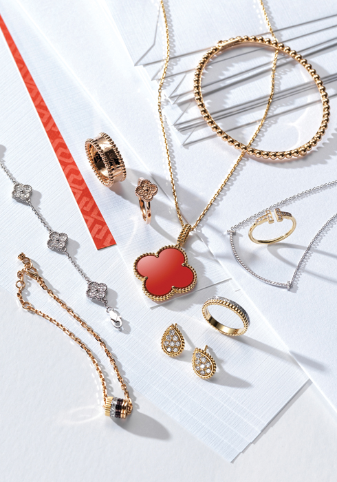스위트 알함브라 뉴 컬렉션 다이아몬드 파베 브레이슬릿 1천1백만원대, 핑크 골드에 브랜드 로고를 인그레이빙한 뻬를리 시그너처 링 2백70만원, 핑크 골드 스위트 알함브라 뉴 컬렉션 링 2백60만원, 레드 컬러 카닐리언을 세팅한 매직 알함브라 롱 네크리스 6백60만원대, 핑크 골드 뻬를리 브레이슬릿 5백70만원대 모두 반클리프 아펠.