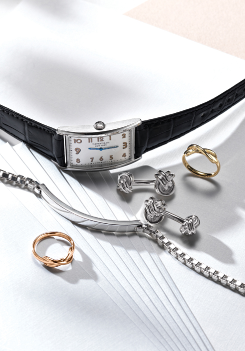 (왼쪽 위부터 시계 방향으로) 독특하고 클래식한 디자인의 티파니 이스트 웨스트 워치. 상징적인 디자인으로 유니크한 디자인을 원하는 이들에게 추천한다. 4백만원대. 영원을 의미하는 인피니티 링 옐로 골드 1백만원대. 매듭을 형상화한 더블 노트 커프스 링크 70만원대. 스털링 실버로 볼륨감 있게 완성한 I. D. 브레이슬릿 40만원대. 인피니티 링 로즈 골드 1백만원대. 모두 티파니.