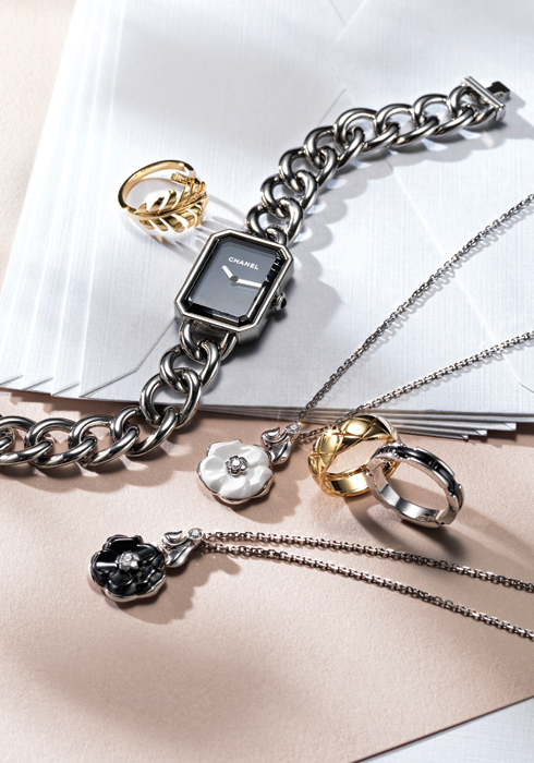 (왼쪽 위부터 시계 방향으로) 깃털에서 영감을 받은 옐로 골드 플룸 링 3백만원대, 파리 방돔 광장의 팔각 형태에서 영감을 받은 케이스 사이즈 28mm의 프리미에르 워치 5백만원대, 화이트 세라믹과 블랙 세라믹으로 동백꽃을 표현한 네크리스 각 5백만원대, 샤넬의 아이콘인 퀼팅 패턴을 적용한 코코 크러쉬 스몰 링 2백만원대, 남성과 여성 모두 착용할 수 있는 울트라 미니 밴드 블랙 1백만원대, 모두 샤넬 화인 주얼리.