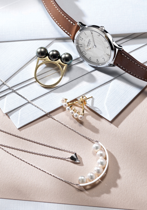 (오른쪽 위부터 시계 반대 방향으로) 올해 새롭게 선보인 에르메스 슬림 데르메스 PM 스틸 버전. 스틸 케이스에  브랜드 고유의 컬러를 담은 레더 스트랩을 매치해 클래식하다. 3백80만원대 에르메스. 문의 02-3448-0728. 최상급 남양 흑진주를 세팅한 밸런스 에라 링 2백60만원대, 상어의 이빨에서 영감을 받은 이어커프 2백20만원대, 식물의 가시에서 영감을 얻은 손즈 컬렉션 1백10만원대, 최상급 아코야 진주를 골드 바에 그네처럼 세팅한 밸런스 플러스 네크리스 2백50만원대 모두 타사키.