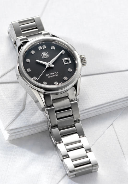 태그호이어 까레라 레이디 칼리버 9 28mm의 심플한 사이즈에 다이아몬드 인덱스, 블랙 다이얼이 우아한 시그너처 디자인. 오토매틱 워치로 백 케이스를 통해 칼리버 9 무브먼트의 매력적인 움직임을 볼 수 있다. 3백만원대.