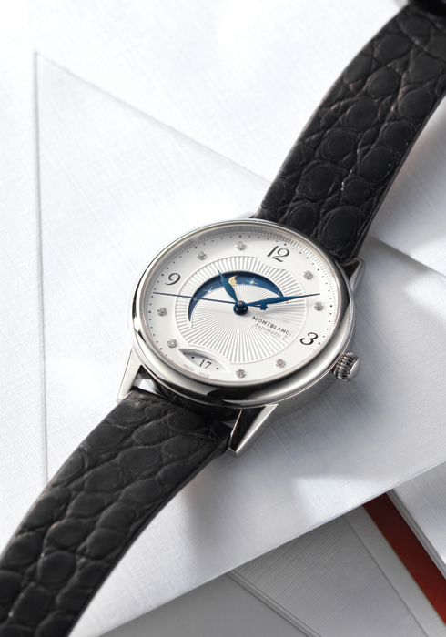 몽블랑 보헴 데이앤나잇 오토매틱 34mm의 실용적인 케이스 사이즈에 클래식한 기요셰 패턴, 아라비아숫자와 어우러진 다이아몬드 인덱스는 물론 가장 인상적인 데이앤나잇 인디케이션과 6시 방향의 데이트 창까지, 클래식 워치의 매력적인 요소를 모두 담은 디자인이다. 3백80만원대.