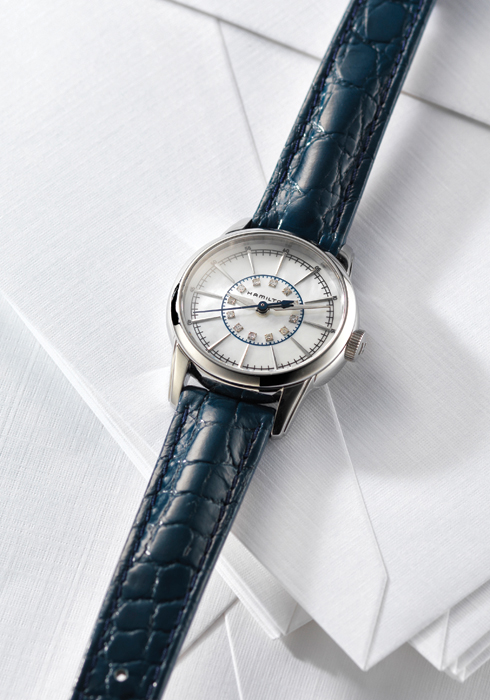 해밀턴 레일로드 레이디 쿼츠 실용적인 사이즈의 다이얼에 다이아몬드를 세팅한 여성스러운 워치. 네이비 컬러 레더 스트랩이 포인트가 되어준다. 79만원.