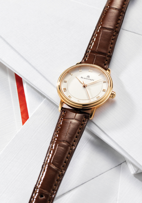 블랑팡 우먼 컬렉션 울트라 슬림 레드 골드로 완성한 입체적인 베젤과 로만 인덱스, 브라운 앨리게이터 스트랩을 매치한 클래식 워치. 2천2백만원대.