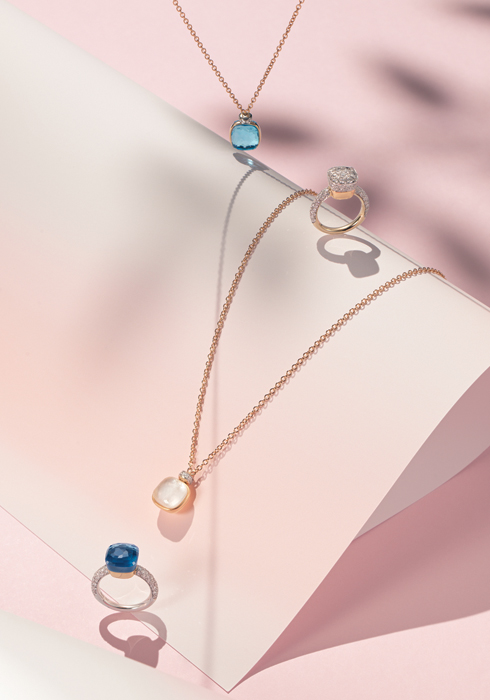 (위부터 차례대로) 맑고 투명하게 빛나는 12.9캐럿의 스카이 블루 토파즈 펜던트가 눈길을 사로잡으며, 총 0.1캐럿의 10개 다이아몬드를 세팅한 18K 로즈 골드와 화이트 골드 소재의 누도 펜던트 네크리스, 총 1.8캐럿의 1백5개 다이아몬드를 정교하게 세팅한 18K 화이트 골드와 로즈 골드 소재의 누도 링, 11.3캐럿의 화이트 토파즈와 머더오브펄 펜던트가 우아한 무드를 선사하며 0.1캐럿의 10개 다이아몬드를 가미한 18K 로즈 골드와 화이트 골드 소재의 누도 펜던트 네크리스, 심플하고 도시적인 느낌의 10캐럿 런던 블루 토파즈와 터쿼이즈가 존재감을 자랑하고 밴드에는 총 0.7캐럿의 58개 다이아몬드를 촘촘하게 세팅한 링 모두 가격 미정 포멜라토. 문의 02-6905-3342 |
