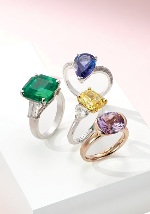 (위부터 차례대로) 총 3.18캐럿의 페어 셰이프 탄자나이트가 눈길을 끌며, 주변에 다이아몬드를 파베 세팅한 18K 화이트 골드 소재의 쏜 엠브레이스 어트렉션 밴드 링 가격 미정 스티븐 웹스터 02-2231-1592. 총 7.64캐럿 옥타곤 컷 에메랄드가 컬러감을 자랑하며, 1.02캐럿 바게트 컷 다이아몬드를 세팅한 컬러 오브 링 가격 미정 파베르제 02-3442-4706. 총 3.02캐럿 쿠션 컷 옐로 다이아몬드가 독보적인 반짝임으로 눈길을 사로잡는 링 가격 미정 그라프 02 -2256-6810. 총 3캐럿의 콘케이브 컷 자수정이 영롱한 색감을 선사하는 18K 사쿠라 골드 소재의 루미노 자수정 링 가격 미정 타사키 02-3461-5558. |
