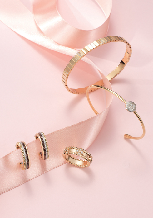 (위부터 차례대로) 핑크 골드 소재에 다이아몬드를 정교하게 세팅한 젬 디올 브레이슬릿 가격 미정 디올 파인주얼리 02-3280-0104. 총 0.2캐럿의 22개 다이아몬드를 세팅해 손목 위에 우아함을 선사하는 18K 로즈 골드 소재의 사비아 브레이슬릿 가격 미정 포멜라토 02-6905-3342. 골드 비즈의 아름다움을 보여주는 뻬를리 컬렉션으로 클로버 모티브를 다이아몬드로 표현한 18K 로즈 골드 소재의 뻬를리 스위트 클로버 링 가격 미정 반클리프 아펠 1877-4128. 총 0.28캐럿의 80개 라운드 다이아몬드를 세팅하고 핑크·화이트·옐로 골드와 브라운 PVD의 조화가 돋보이는 콰트로 클래식 스몰 후프 이어링 9백만원대 부쉐론 02-3213-2246. |