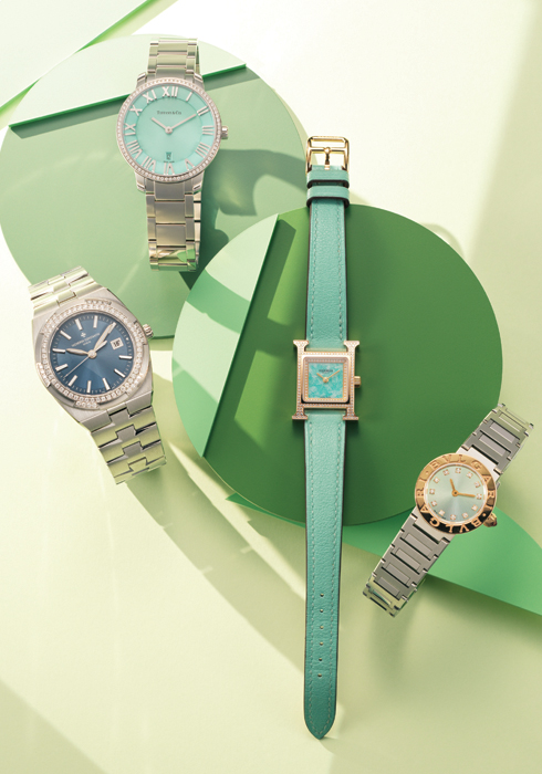 (왼쪽부터 차례대로) 말테 크로스를 연상시키는 6면 베젤에 78개의 브릴리언트 컷 다이아몬드로 장식해 여성스러움과 섬세함을 표현했으며, 데님 블루 색상 다이얼과 스틸 소재의 케이스와 브레이슬릿으로 캐주얼한 느낌까지 주는 쿼츠 워치 오버씨즈 33mm 2천2백만원대 바쉐론 콘스탄틴 1877-4306. 스테인리스 스틸 소재의 지름 31mm 케이스와 총 0.14캐럿 라운드 브릴리언트 다이아몬드를 세팅한 베젤, 티파니 블루 아주레 다이얼이 어우러져 우아하고 사랑스러운 무드를 더하는 쿼츠 무브먼트 2-핸드 31mm 워치 가격 미정 티파니 02-6250-8620. 브랜드의 아이코닉한 알파벳 H 모양의 가로세로 21mm 케이스에 총 0.072캐럿의 다이아몬드 52개를 세팅하고 아마조나이트 다이얼과 비슷한 컬러의 아테나 송아지가죽 브레이슬릿을 매치한 H 아워 미니 2천2백만원대 에르메스 02-542-6622. 블랙핑크 리사와 컬래버레이션해 선보인 리미티드 에디션 워치로 스테인리스 스틸 소재 케이스에 더블 로고 인그레이빙을 더한 18K 로즈 골드 베젤을 매치하고 컬러가 변하는 선레이 마감 다이얼과 다이아몬드 인덱스로 화려한 무드를 추가한 개성 넘치는 디테일의 불가리x리사 리미티드 에디션 워치 7백95만원 불가리 02-2056-0170. |