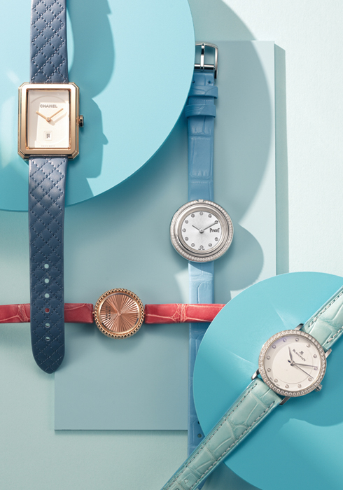 (왼쪽 위부터 시계 방향으로) 18K 베이지 골드 케이스에 오팔린 기요셰 다이얼과 브랜드 상징인 트위드를 연상시키는 블루 퀼팅 패턴 카프 스킨 스트랩을 매치해 클래식하면서도 여성스러운 무드를 선사하는 보이프렌드 워치 가격 미정 샤넬 워치 080-805-9628. 지름 29mm 스틸 케이스에 베젤에는 약 0.37캐럿의 65개 브릴리언트 컷 다이아몬드를 세팅하고 총 0.07캐럿의 11개 브릴리언트 컷 다이아몬드 아워 마크로 포인트를 주었으며, 블루 앨리게이터 스트랩으로 유쾌하고 여성스러운 감성을 더한 포제션 워치 1천만원대 피아제 1668-1874. 지름 29.2mm의 스틸 케이스에 깔끔한 화이트 다이얼을 매치하고, 베젤은 다이아몬드 세팅으로 우아하게 완성했으며, 라이트 블루 앨리게이터 스트랩을 더한 세컨드 핸드 셀프 와인딩 무브먼트로 작동하는 빌레레 울트라 플레이트 1천8백만원대 블랑팡 02-3467-8426. 유쾌한 감성의 여성스러운 뻬를리 컬렉션의 워치로 섬세한 골드 비즈로 베젤을 장식해 마치 꽃과 같은 아름다움을 보여준다. 지름 23mm 18K 로즈 골드 케이스에 기요셰 다이얼을 매치해 신비스러운 느낌까지 더한 스위스 쿼츠 무브먼트의 뻬를리 워치 1천3백만원대 반클리프 아펠 1877-4128. |