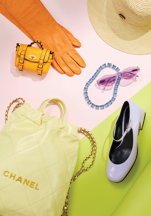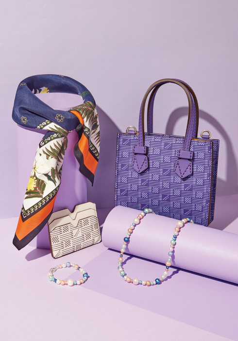 (왼쪽 아래부터 시계 방향으로) 다양한 파스텔컬러와 사이즈의 담수 진수로 변주를 주어 멋스러운 팔찌 59만5천원 해튼 랩스 by 폼라운지, 콤팩트한 사이즈임에도 넉넉한 수납력을 자랑하며 베이지 컬러와 모노그램 패턴으로 우아하고 차분한 감성을 전하는 카드 홀더 39만8천원 모로 by 폼라운지, 꽃과 나뭇잎을 프린트해 컬러풀하게 완성한 스카프 17만5천원 토가 by 폼라운지, 고급스러운 퍼플 컬러의 가죽 소재에 모노그램 패턴을 더해 룩에 포인트를 주는 미니 사이즈 토트백 2백59만원 모로 by 폼라운지, 다양한 컬러와 사이즈의 담수 진주를 활용해 개성 있는 연출을 도와줄 네크리스 89만5천원 해튼 랩스 by 폼라운지 02-3438-6142. |